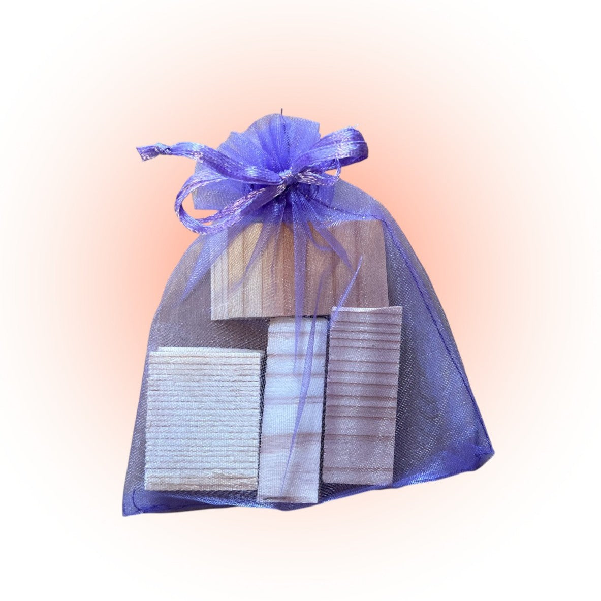 川根から発送される商品に、茶箱の材料であるスギの端材を活用して作った「消臭袋」をプレゼントしています。靴の中、下駄箱、玄関先などに置いてどうぞご活用ください。